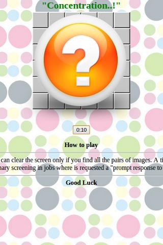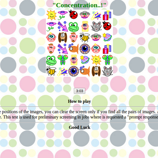 In this game you have to remember the positions of the images, you can clear the screen only if you find all the pairs of images. A timer will tell you how fast or slow is your response. This test is used for preliminary screening in jobs where is requested a "prompt response to an action".