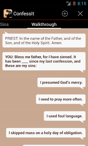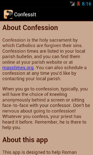 ConfessIt is a Roman Catholic examination of conscience app for your Android device. It is designed to be simple and easy to use, and it will help you remember your sins for confession. There is also a confession walkthrough which tells you exactly what your confessor will say and how you should respond. The examination of conscience is based on fundamental Catholic church teachings, is easy to understand, and is relevant for modern Catholics.