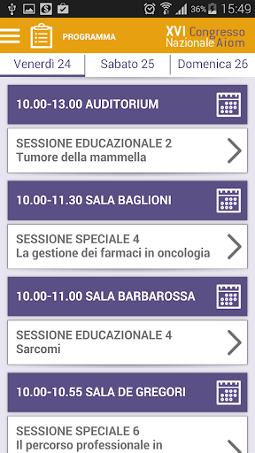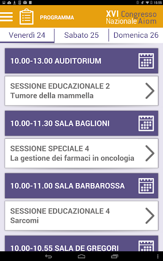 - Programma del congresso, navigabile per data e tipologia di sessione. L’applicazione consente di selezionare le sessioni di interesse per aggiungerle alla propria agenda personale e al proprio calendario di sistema e di aggiungere note personali ad ogni relazione;