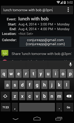 * Create calendar events using natural language (English only for now). Simply describe an event in plain English and watch as Conjure understands what you type. For example: "lunch tomorrow @ 3pm".