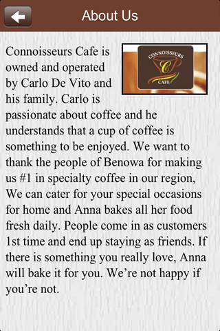 Connoiseurs Cafe is a popular coffee shop located in the Gold Coast, Australia. You should download this free App if you are, or intend to be, a customer of ours. You can view our menu, read and leave reviews, see our specials, use our loyalty card system on your phone and much more.