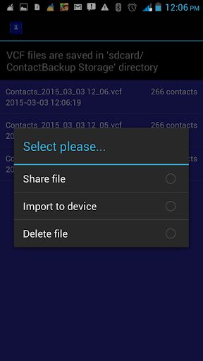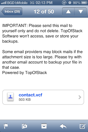 Backup your contacts in a simple and convenient way... You can backup all your contacts to SDCard/Gmail. All contacts are in vcf format which will be supported by most of the smart phones (Android,IPhone,Blackberry). In this application you can backup all your contacts into SDCard in vcf format.That file is emailed.And you can import contacts just downloading it from your mail.As the vcf file is in your mail,your privacy is maintained.
