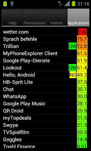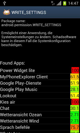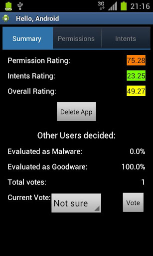 ContrOWL is a security app that helps you find potential threads among your installed apps. It can also check freshly added apps on the fly and notify you if an app is rated as suspicious. ContrOWL also gives you information about top used permissions and broadcast intents of malware apps which should help you to evaluate them. Please read the help tab in ContrOWL to better understand how to use and understand it.