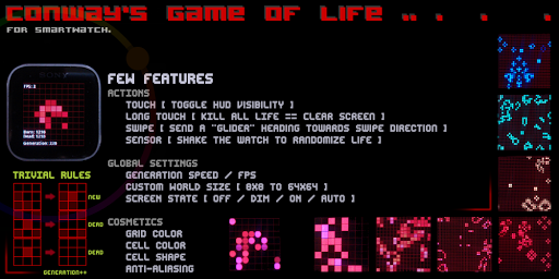生命游戏,是不是一个真正的游戏,而是元胞自动机(约翰·霍顿康威,1970),可以住,复制或死亡。观察细胞如何演变您的SmartWatch的屏幕上。