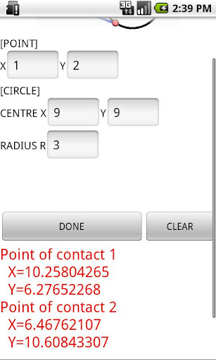 The point which touches a circle from a point is calculated. Two coordinates are calculated when there are two intersections.