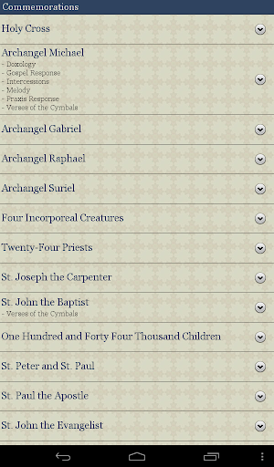 You may choose between different graphical themes as well as change the document text size. A presentation mode is also supported that allows you to project the content in your church for a complete experience. The application also allows you to control which saint or archangel commemorations will be shown in doxologies, hymns, responses, and other prayers for your church's intercessors.