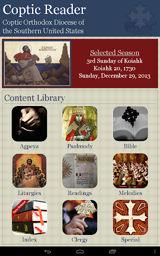 Coptic Reader is a mobile application that contains the liturgical text, rites, psalmodies, hymns, melodies, services, and sacraments of the Coptic Orthodox Church. See below for a full list of included content. Coptic Reader is not simply a text reader but rather it dynamically creates each document/service according to the rites of the current day, or selected day/feast. Coptic Reader builds each document on the fly with all appropriate hymns, rites and instructions to take the guess work out of the order of a church service.