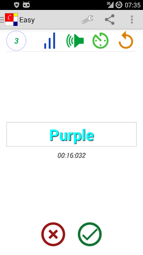 Quickly identify correct association between color and written color name (Stroop effect), while hearing note (chromesthesia, a color to sound synesthesia, for easy and medium level).
