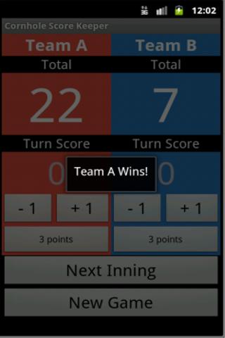 This app help you keep score in a Cornhole match. This app lets you play until one team gets to 21. You will then get a pop up that announces the winner. The New Game button will reset the game. There is also a game reset in the menu.