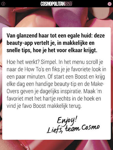 je naar de How To’s en fiks je je favoriete look in een paar minuten. Of start een Boost en krijg elke dag een handige beauty-tip en de Make-Overs geven je dagelijks inspiratie. Maak 'm favoriet met het hartje rechts in