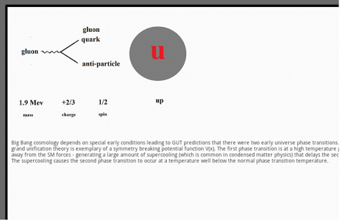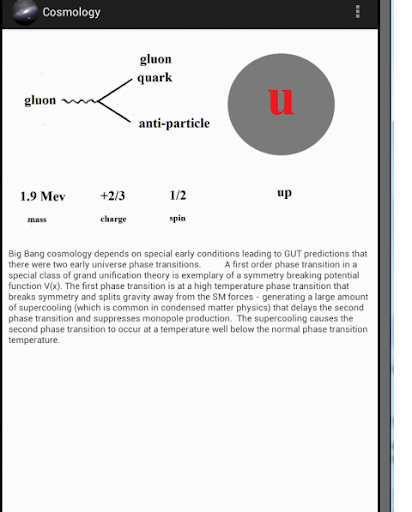 This app provides a synopsis of the first seconds following the Big Bang and the Inflation period. It discusses the symmetry breaking process that resulted in splitting the original force into the four forces of the Standard Model today. In addition, it displays basic information about the Fermions and Boson of the Standard Model.