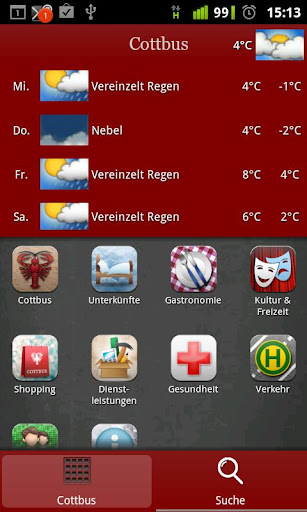 Apotheken. Die Anbindung an CottbusVerkehr ermöglicht die sofortige Verbindungssuche von Bus & Tram mit einer sehr detaillierten Darstellung. Die Wetterfunktion zeigt das aktuelle Wetter sowie eine 4-Tages-Vorschau.