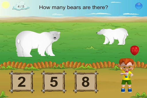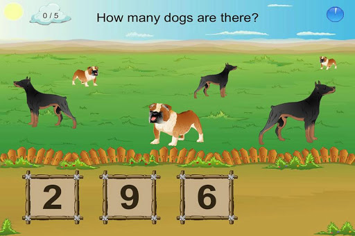 In the gameplay session, the child is shown different animals and is asked to count the number of animals being shown. Each screen appears with n number of a single animal, together with three answers one of which is right.