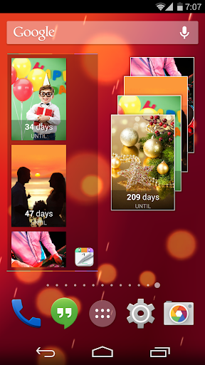 The Countdown Plus app doesn’t stop there. Configure your countdown widget to see your events directly on your home screen. From a single countdown display widget, to countdown collection widgets, you can view multiple countdowns in a stack, grid, or a simple list of countdowns. It doesn't stop there. See the time left to your events customized with your own images. Keeping track of your events has never been easier.