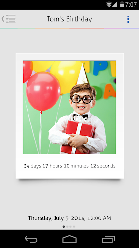 - Integrates with your Facebook events and friends birthdays. Monthly display of birthday and events with one click quick add to your Countdowns list.