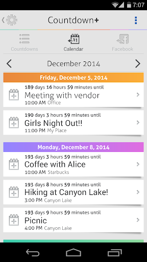 Countdown Plus Widget Calendar also features a countdown calendar for Facebook events and birthdays. Countdown Plus integrates seamlessly with your Calendar and Facebook events to show countdowns for events and friend's birthdays. You can pick your most important Calendar events track and add to your Countdowns with a single click. This makes Countdown Plus a great Birthday Calendar. Each calendar entry is a countdown clock so you see the exact time left to each event.