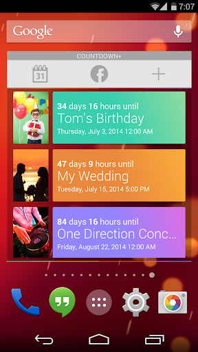 Add unlimited countdowns for events with Countdown Plus Widget Calendar (also known as Countdown+) the top countdown app on Google Play! Countdown to birthdays, weddings, spring break, graduation, cruise, trips, retirement, concerts, any memorable events in your Calendar and even Facebook. Also countdown to holidays such as Christmas, Easter, New Years, Valentines, you name it. Featuring beautiful widgets with your own images and backgrounds, keeping track of events has never been more fun!