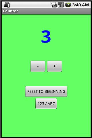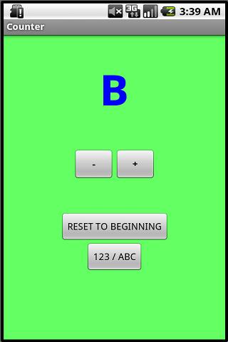This is a great app for preschool aged children, learning to count and say the alphabet! Two buttons for incrementing and decrementing through numbers and the alphabet. A simple button to reset everything back to the beginning, and another button to flip between numbers and letters. Very entertaining for young children!