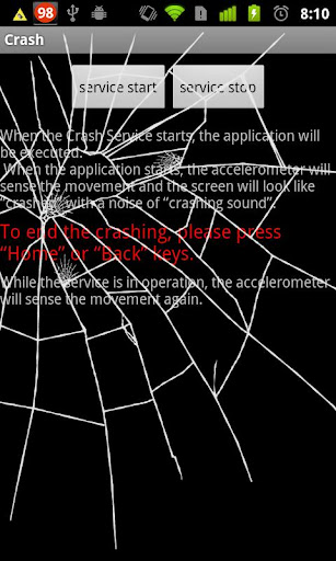 When the application starts, the accelerometer will sense the movement and the screen will look like “crashed” with a noise of “crashing sound”.