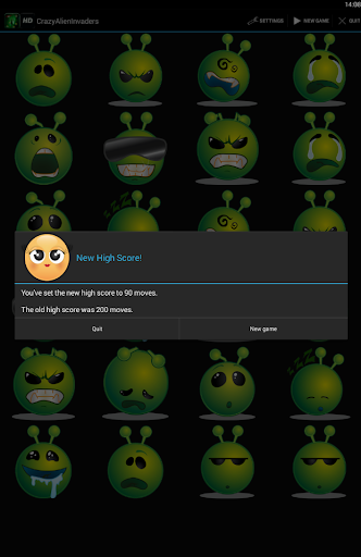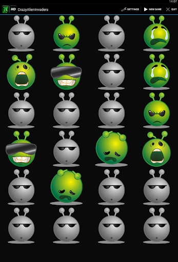 Initially you will see all cards turned face down. Tap on one of the cards and remember the picture on it. With the next tap try to find and flip the card with the same Crazy Alien as previous one. If the Crazy Aliens are on both memory cards are the same, they will stay opened and you can continue with the next pair. Otherwise both cards will flip back over and you will get another try. Try to find all the Crazy Alien Invader matched cards as fast as possible.