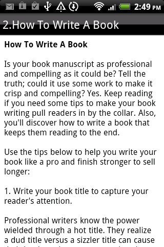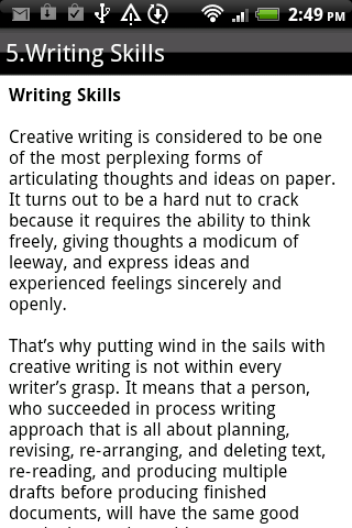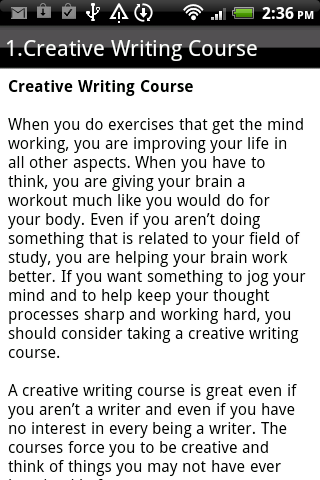 Creative Writing is a free app that has been well researched and made to be a quality app. It is designed to give lots of help to aspiring writers. It provides you with information. Chapters include;