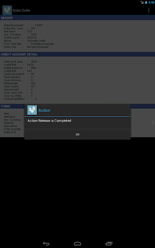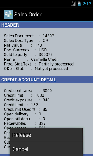 Scenario: Sales representatives create a sales order in SAP system on behalf of a customer. Before sales orders can be processed further, the credit manager must ensure that the customer has a sufficient credit score to create additional sales order. In general, based on SAP credit block configuration, the current total liability plus the order value of the newly created sales order must not exceed customer's credit limit otherwise the newly created sales order will be blocked automatically. In such case, this application can help the credit manager to release or cancel the pending sales order from his/her mobile device anytime and anywhere.