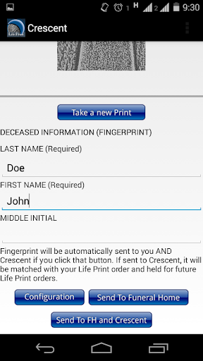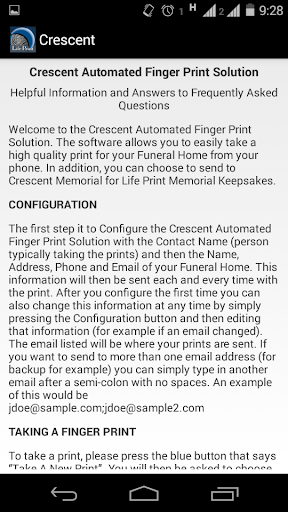The Crescent Automated Finger Print Solution is software, used in conjunction with a phone, that allows a Funeral Home employee to take fingerprints for body identification or for the development of cremation jewelry. The software is to be used on Android Devices to allow a Funeral Home employee to take high quality prints to save for the Funeral Home and/or to send to Crescent for Life Print Memorial Keepsakes and other cremation jewelry.