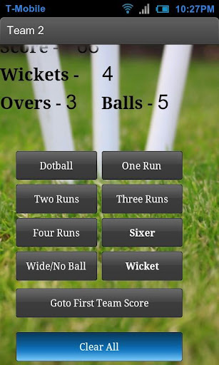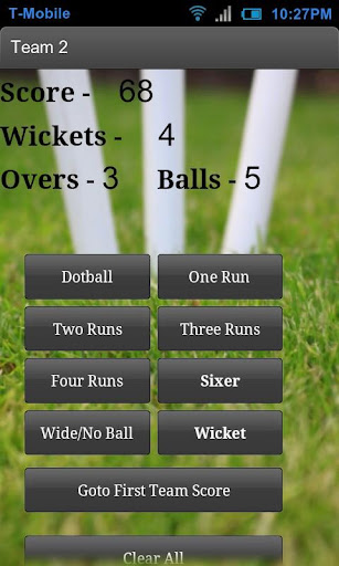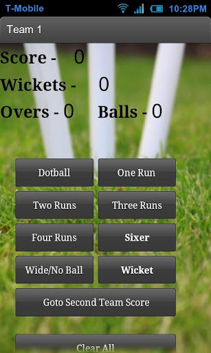 It allows you to score your cricket matches with ease. You can add runs, or wickets to the team's score. The score and wickets are displayed on the top of the screen along with the overs and balls.