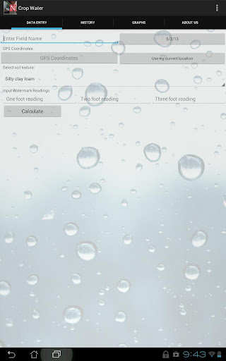 The Crop Water App was developed at the request of Nebraska Agricultural Water Management Network (NAWMN) participants. This app provides an easy way to estimate soil water status based on Watermark sensors installed at depths of 1, 2, and 3 feet. With these sensor readings, the Crop Water app will estimate the water used as well as what is still available for Nebraska soils. You can also see historic sensor readings and graph. Check out the NAWMN at: water.unl.edu/NAWMN.