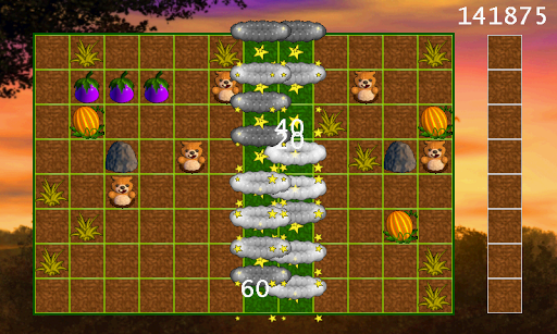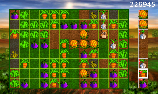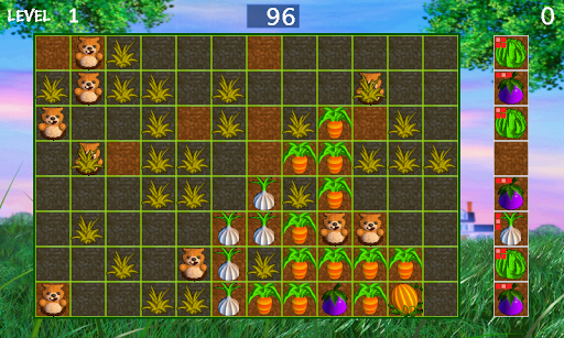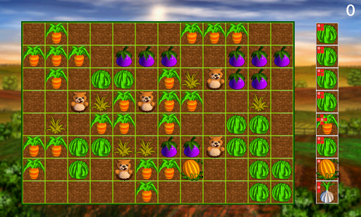 Plant carrots, lettuce, eggplants, onions, and melons in this colorful puzzle game! Line up your crops in vertical or horizontal rows to clear them! When all of your crops are harvested and your weeds and gophers are gone, you've won!