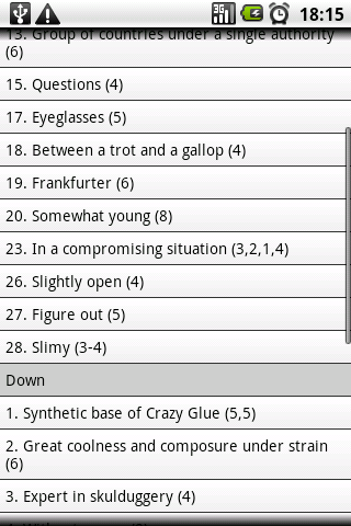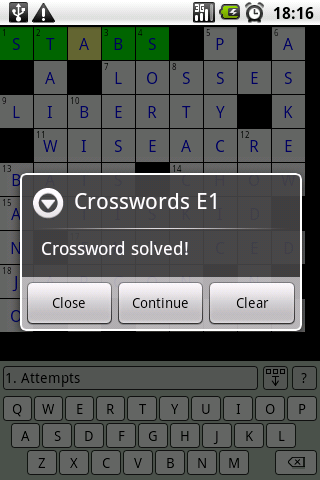 Features include: zooming of the grid, view clue list and select one, highlight incorrect letters, cheat/answer one clue.