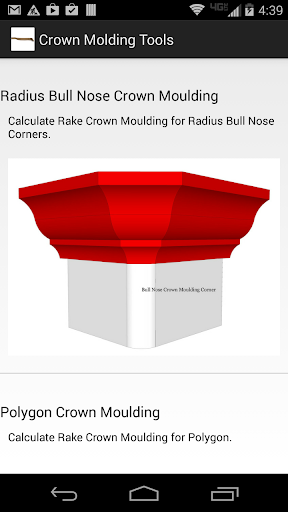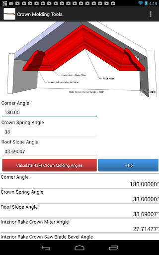 Crown Molding Tools is an android app with functions to calculate complex crown miter angles and saw blade bevel angles that other calculators don't offer.