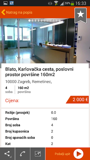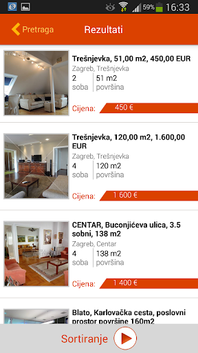 Crozilla Android aplikacija nudi jednostavan pregled svih rezultata Vaše pretrage sa slikom i osnovnim podacima. Moguće je sortirati nekretnine po cijeni, površini, datumu objave i radijusu udaljenosti.
