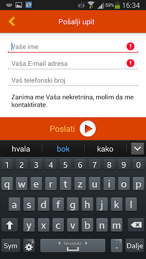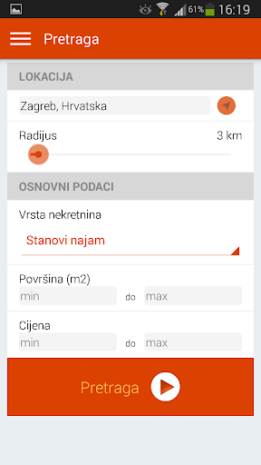 Ukoliko ne želite koristiti provjeru Vaše trenutne lokacije, svakako možete unijeti mjesto gdje želite tražiti nekretnine te odabrati vrstu nekretnine i ograničiti pretragu s rasponom cijene i površine.