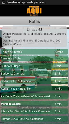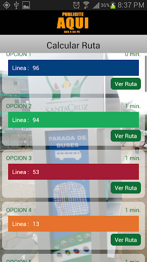 Al hacer click sobre las rutas de la opción deseada, aparecerá la fotografía de un micro de esa línea, para dar una información gráfica del como luce el micro que tiene que tomar, luego al hacer click en la opción “ver ruta” el usuario podrá ver la ruta que describirá la línea hasta el destino indicado. Los resultados están ordenados de tal manera que la opción con el menor tiempo de viaje aparezca primero.