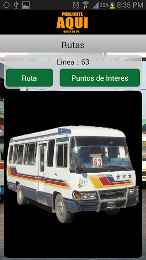 Al hacer click en una de las paradas aparecerá las líneas cercanas a esta ubicación, asi el usuario podrá ver donde tomar la línea deseada de esa parada, ver la fotografía del tipo de micro, la ruta del mismo y los puntos de interés de esa línea, pudiendo realizar las mismas acciones que son permitidas en el modulo “Rutas”