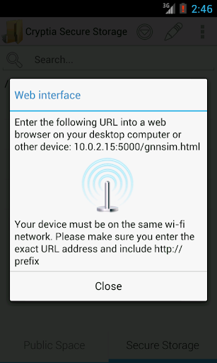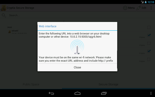You can access the storage from another mobile device or computer by creating a temporary web page for one time remote access. First, you need to enter the container's password on the device with the container file, and generate an access link. Second, enter the link on a remote device while the 'web server' tab of Cryptia Secure Storage is active.