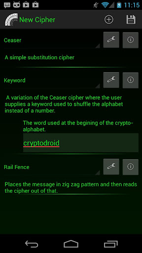 Crypto allows you to use classic ciphers such as Caesar Shift, Keyword or Russian Nihilist to encode / decode your text base messages.