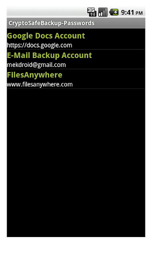 This app, the CryptoSafe Backup Helper, is a handy Backup Utility that can be used to upload the CryptoSafe encrypted backup files to FilesAnywhere, Google Docs and your e-mail account as an attachment.