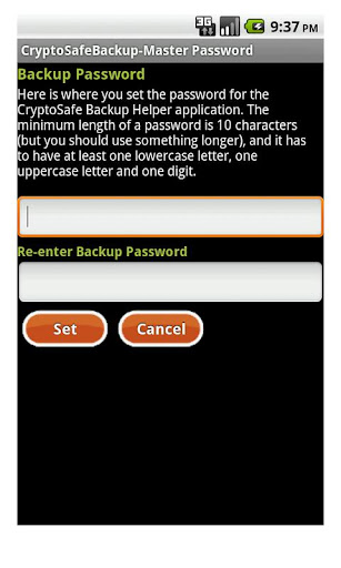 IMPORTANT: You have to create the backup files yourself prior to uploading them. Go to your CryptoSafe Lite or CyptoSafe Pro app and select Utilities:Backup to SD Card. This will create an encrypted backup file of your CryptoSafe database in the SD Card. Then go to the CryptoSafe Backup Helper (this app) and upload the backup. This utility cannot do the creation of the backup for you, because it does not have access to the CryptoSafe database itself (completely separate applications).