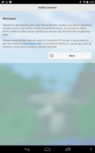 This is the free version of the app, you'll be able to convert up to a 64x128x64 chunk of terrain at a time. If you'd like to convert whole worlds, please get the paid version of the app.