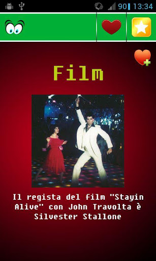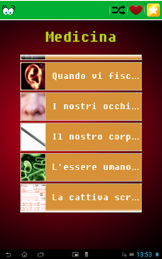 Con i tre pulsanti presenti sulla barra in alto è possibile selezionare una curiosità casuale (icona doppie frecce nere), visitare la sezione dei preferiti inerente ad una particolare categoria (icona cuore) oppure dare una valutazione all'app tramite il pulsante "stella".