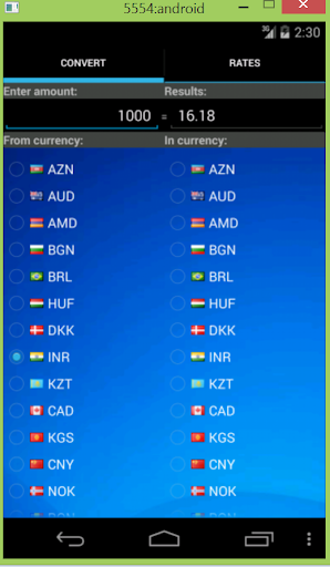 The currency converter is an android application, mainly intended for people to help them to convert the currency of different countries into different currencies. This app is to bring awareness about the values of various currencies in terms of our currency. The process of converting one form of currency into another country's usable currency.