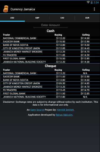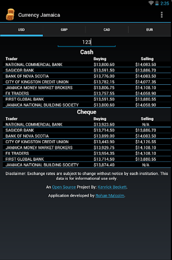 Currency Jamaica, is a simple application that shows how much the Jamaican Dollar (JMD) is being traded for in regards to the other leading currencies and the respective institutions.