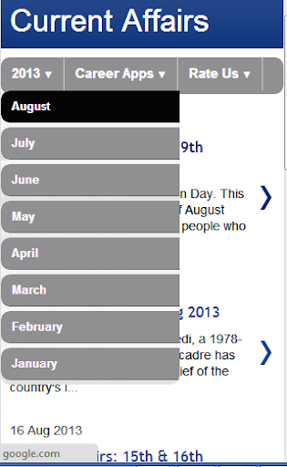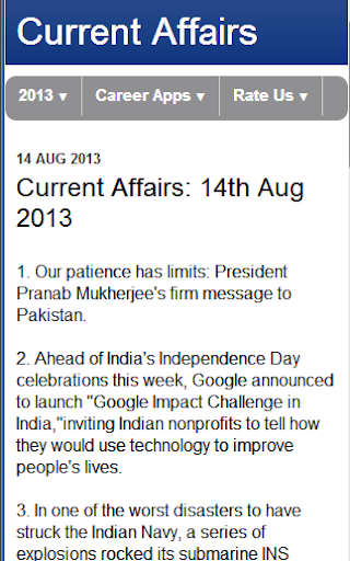 Current Affairs 2014 all over the world are updated Every day. We don't write long stories on daily current affair events. Current affairs are short and to the point with exact information. Our "Current Affairs 2014" app is fast loading with clean navigation. Categorised on monthly wise for easy read.