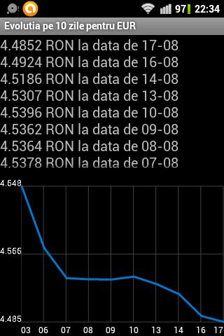 Apasati pe o intrare din lista pentru a vedea evolutia pe ultimele 10 zile impreuna cu graficul aferent. Rotiti in mod landscape pentru un grafic mai mare. Efectuati swipe (miscati degetul repede de la stanga spre dreapta)pe un element din lista si puteti accesa convertorul valutar