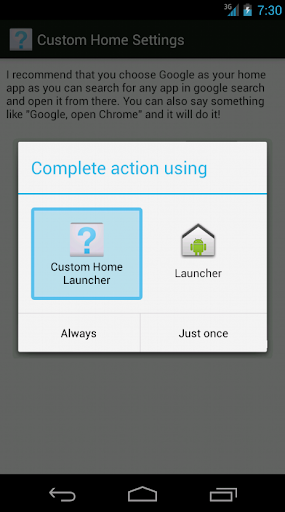 Formerly known as Google Search Launcher, Custom Home Launcher is now even more powerful and lets you choose which one of your currently downloaded apps you want to open when you press the home button on your android phone! The possibilities are endless, but I highly recommend choosing the basic Google Search app to be your new home screen because as soon as you type in the first few letters of the app you want, it will offer the app for you to open. Also, as a bonus, you can say "Google, Open /Insert app here/" and it will open whichever app you want. To achieve this radically minimalistic home screen action, download this app, and when you run it, you can click a notification to get into settings where you can change the custom home app you want to Google.