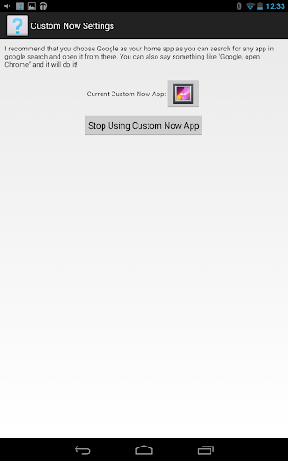 Do you like being able to swipe the home button up and jump into Google Now, but wish it would open a different app of your choosing? Like the camera or your text messaging app? Download this app and it will let you choose what app it should open. Choose from any app you have installed. Only intended for phones with virtual navigation buttons (like the Nexus 4 or Galaxy Nexus).