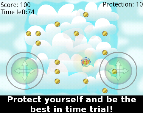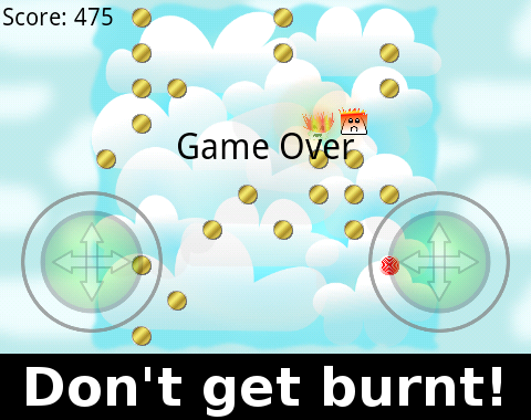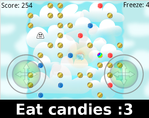 Catch as many coins as you can. But watch out! The blob monster wants to burn you! But that's not everything! Power-ups are still available: the candies which protect you or freeze the monster.
