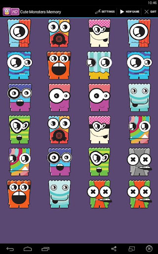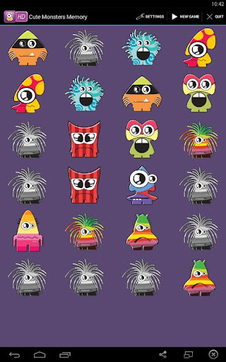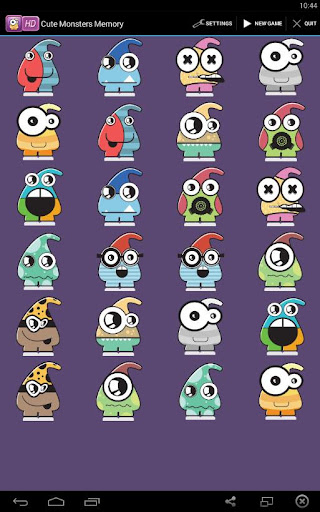 Cute Monsters Memory Game suitable for everyone, regardless of age and gender. This Cute Monsters Memory Game will help you to relax or pass the time. The object of the game is to turn over pairs of matching Monsters. Finally, a game you never feel guilty playing that never leaves you bored! Three different sets of monsters, you can change them any time in settings.